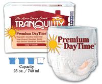Tranquility Premium DayTime Adult Disposable Absorbent Underwear Extra-Large, 48" to 66" Waist/Hip, 210+ lb, Latex-free Tranquility Premium DayTime&trtade; Disposable Absorbent Underwear offers outstanding, discreet and comfortable protection. Guaranteed performance ensures confidence and comfort during active daytime hours. The peach mat absorbent core guarantees skin dryness, odor control and pH neutralization. Kufguards (inner leg cuffs) protect against leakage. Tear-away side seams allow for easy removal. Comfortable, breathable fabric has an ample, full-rise waist panel providing a more proportioned fit.